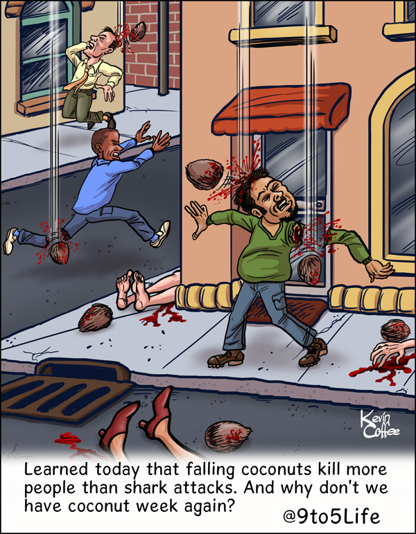 Learned today that falling coconuts kill more people than shark attacks. And why don't we have coconut week again? - @9to5Life~Illustration by:Â Kevin Coffee~