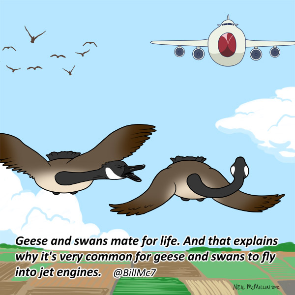 Geese and swans mate for life. And that explains why it's very common for geese and swans to fly into jet engines.
