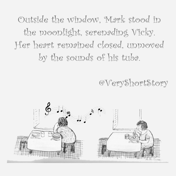 Outside the window, Mark stood in the moonlight, serenading Vicky. Her heart remained closed, unmoved by the sounds of his tuba. @VeryShortStory