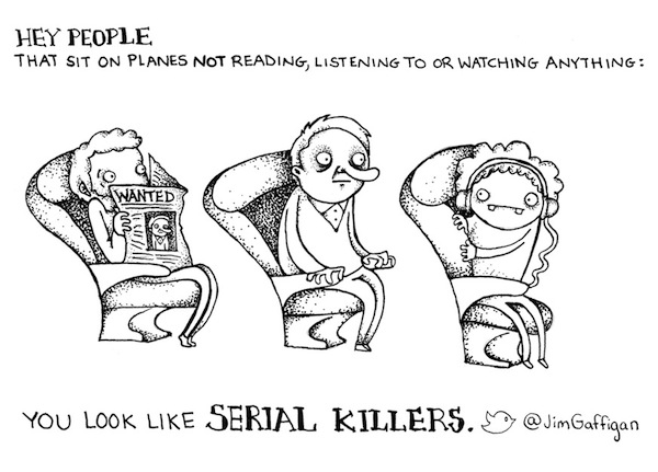 Hey people that sit on planes not reading, listening to or watching anything: you look like serial killers. @JimGaffigan