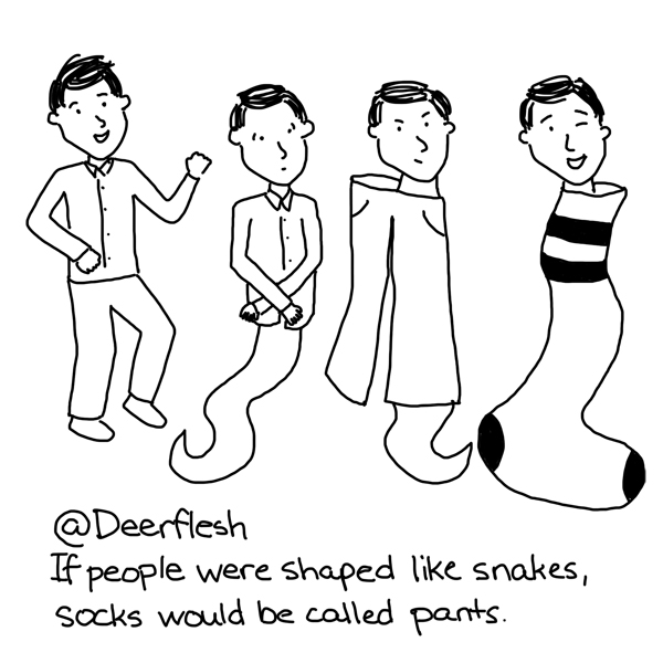 If people were shaped like snakes, socks would be called pants. - @Deerflesh