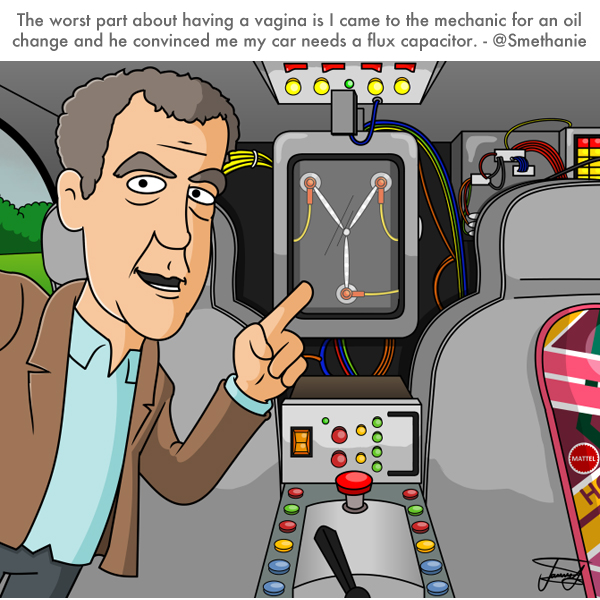 The worst part about having a vagina is I came to the mechanic for an oil change and he convinced me my car needs a flux capacitor. -Â @Smethanie