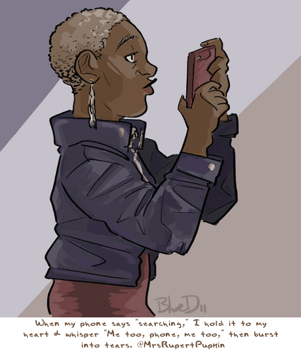 When my phone says "searching," I hold it to my heart & whisper "Me too, phone, me too," then burst into tears @MrsRupertPupkin