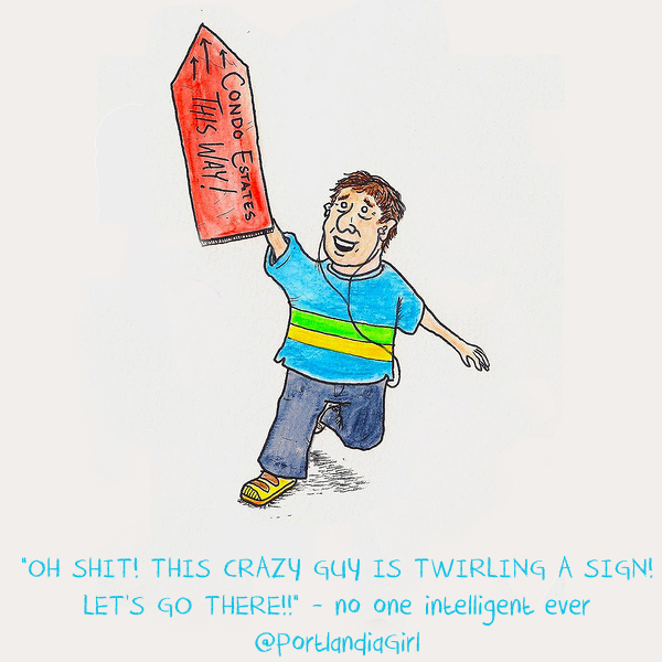 "OH SHIT! THIS CRAZY GUY IS TWIRLING A SIGN! LET'S GO THERE!!" - no one intelligent ever @PortlandiaGirl