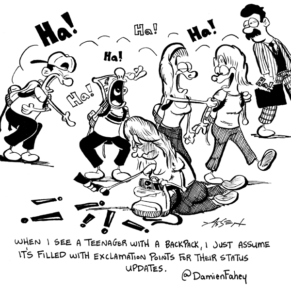 When I see a teenager with a backpack, I just assume it's filled with exclamation points for their status updates. @DamienFahey