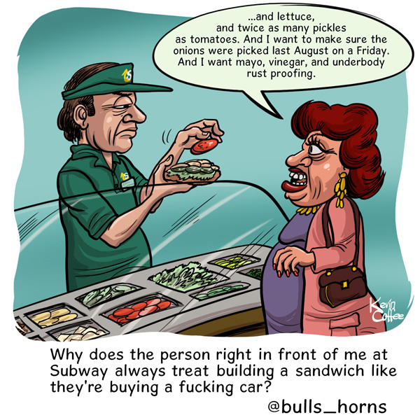Why does the person right in front of me at Subway always treat building a sandwich like they're buying a f#@&ing car?  @bulls_horns