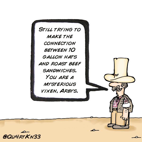 Still trying to make the connection between 10 gallon hats and roast beef sandwiches. You are a mysterious vixen, Arbys @Qu4rtKn33