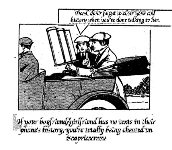 If your boyfriend/girlfriend has no texts in their phone's history, you're totally being cheated on.  @capricecrane