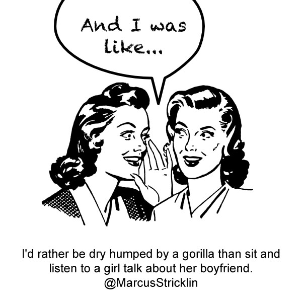 I'd rather be dry humped by a gorilla than sit and listen to a girl talk about her boyfriend. @MarcusStricklin