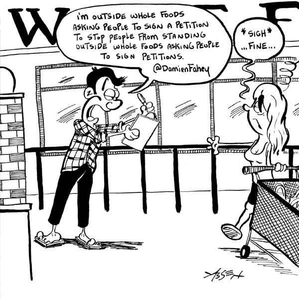 I'm outside Whole Foods asking people to sign a petition to stop people from standing outside Whole Foods asking people to sign petitions. @DamienFahey