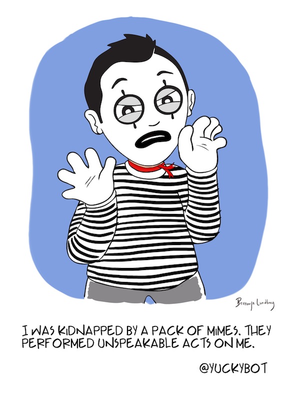 I was kidnapped by a pack of mimes. They performed unspeakable acts on me. - @YUCKYBOT