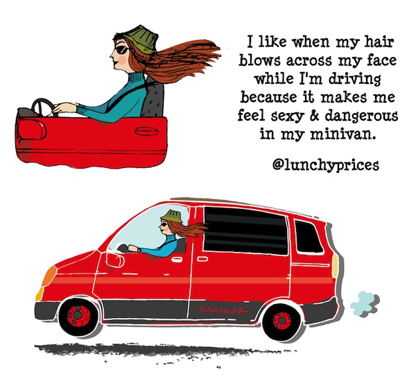 I like when my hair blows across my face while I'm driving because it makes me feel sexy & dangerous in my minivan. -Â @lunchyprices