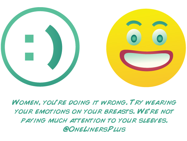 Women, you're doing it wrong. Try wearing your emotions on your breasts. We're not paying much attention to your sleeves. - @OneLinersPlus