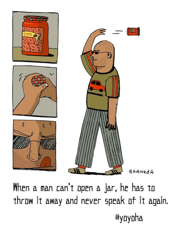 When a man can't open a jar, he has to throw it away and never speak of it again. -Â @yoyoha