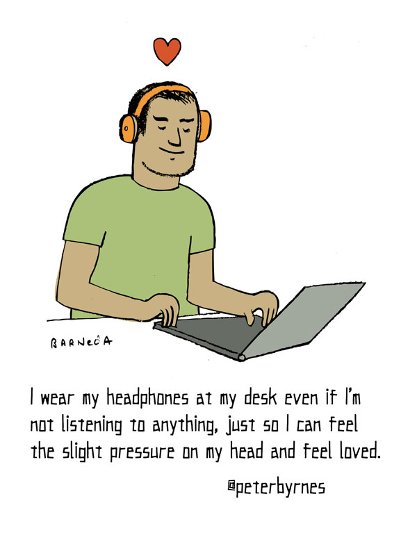 I wear my headphones at my desk even if I'm not listening to anything, just so I can feel the slight pressure on my head and feel loved. - @peterbyrnes no. 291 - @danhhoang