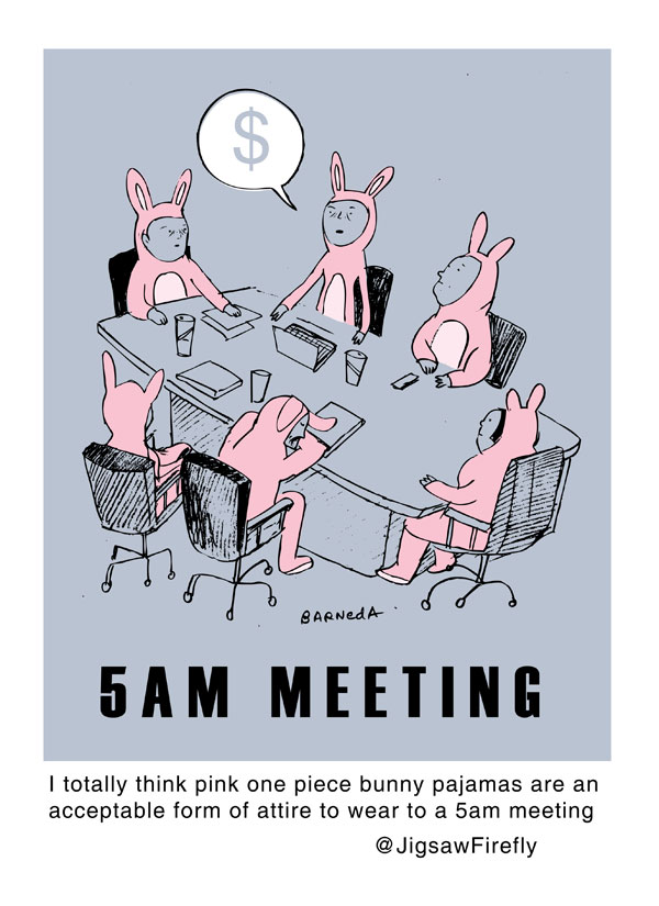I totally think pink one piece bunny pajamas are an acceptable form of attire to wear to a 5am meeting - @JigsawFirefly