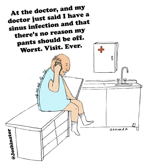 At the doctor, and my doctor just said I have a sinus infection and that there's no reason my pants should be off. Worst. Visit. Ever. @Joshinator