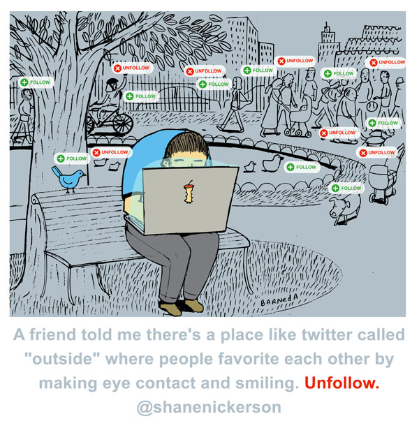 A friend told me there's a place like twitter called "outside" where people favorite each other by making eye contact and smiling. Unfollow. -Â @shanenickerson