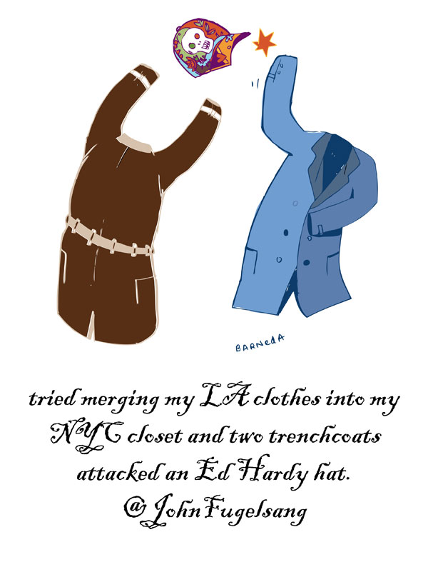 tried merging my LA clothes into my NYC closet and two trenchcoats attacked an Ed Hardy hat. @JohnFugelsang