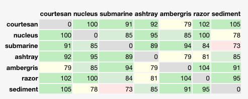 Turns out they only use seven of your words, for various reasons they explain. I can see how my lowest score came from submarine and sediment. The highest score was between courtesan and sediment.