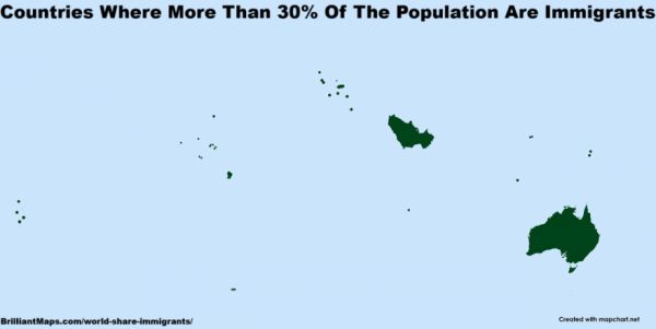 The image above showing the nations with more than 30% immigrants has two sizable countries. In Saudi Arabia, native-born citizens are supported by oil money through the government, so they hire people from other countries to do the work (smaller oil states do likewise). Australia just seems like a great place to live, despite the deadly wildlife.